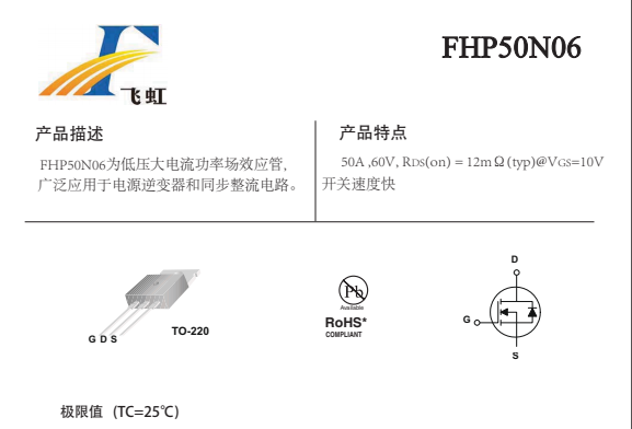 FHP50N06的主要封裝形式是TO-220、TO-252、TO-263三種,60V低壓MOS管50N06腳位排列位GDS。這款50N06場效應(yīng)管產(chǎn)品具體參數(shù):Vgs(±V):25;VTH(V):2-4;ID(A):50;BVdss(V):60。RDS (on) = 12mΩ(typ)@V GS =10V。內(nèi)阻低,溫升低的特點。